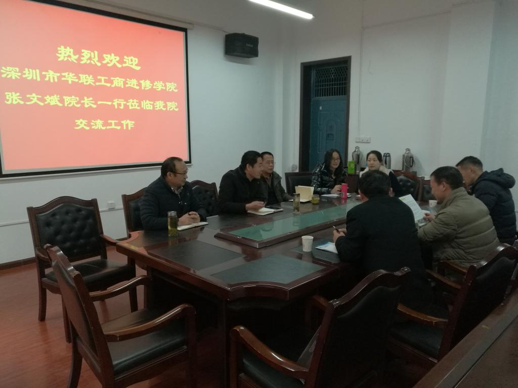 2018年12月27日上午,深圳市华联工商进修学院院长张文斌一行三人来米兰官网ac米兰官网中文网站走访、调研。ac米兰官网中文网站副院长刘玉森,培训部、教务科、办公室负责人等参加了座谈会,会议由刘玉森主持。